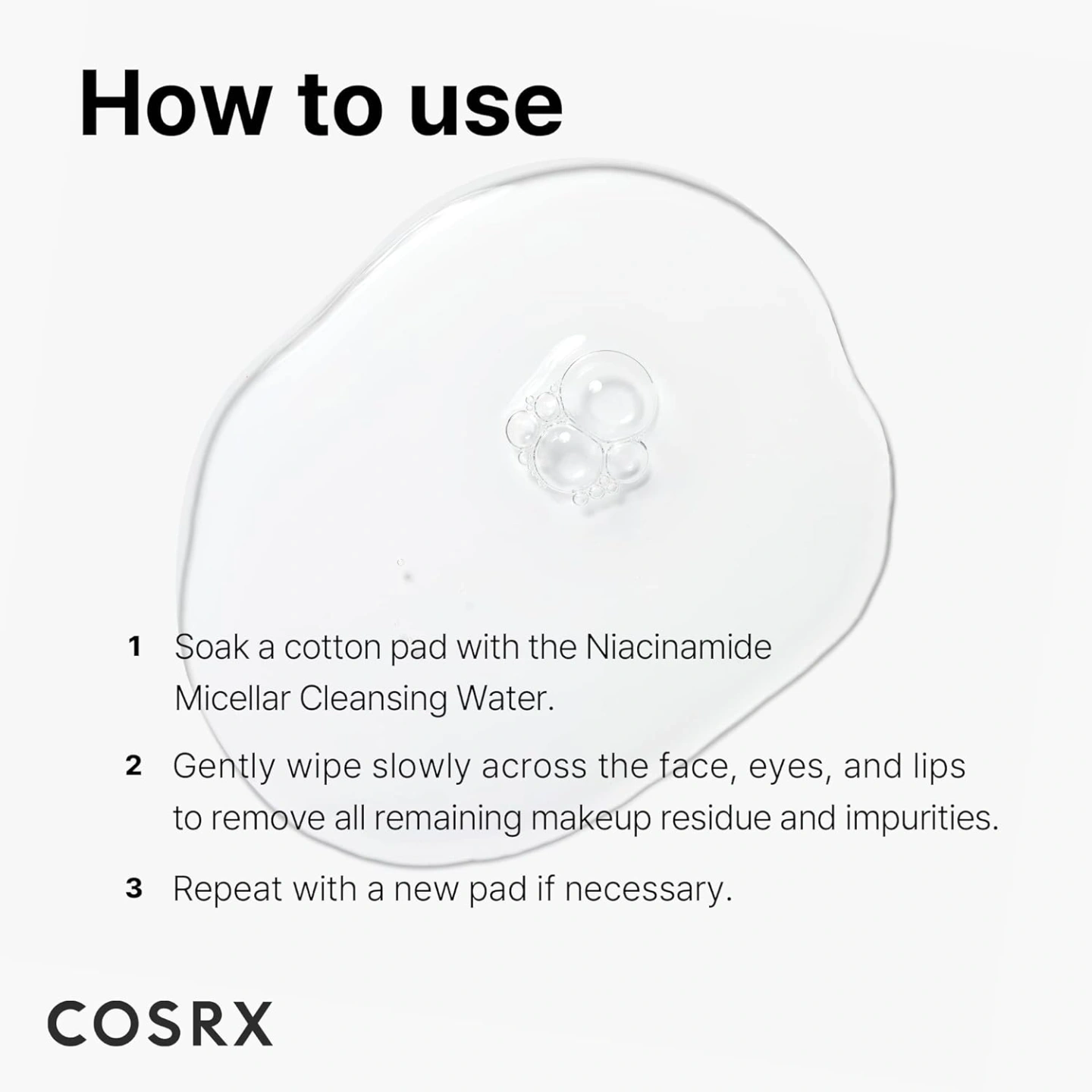 Pour on to a cotton pad and gently wipe all over the skin until all makeup and impurities have been removed.