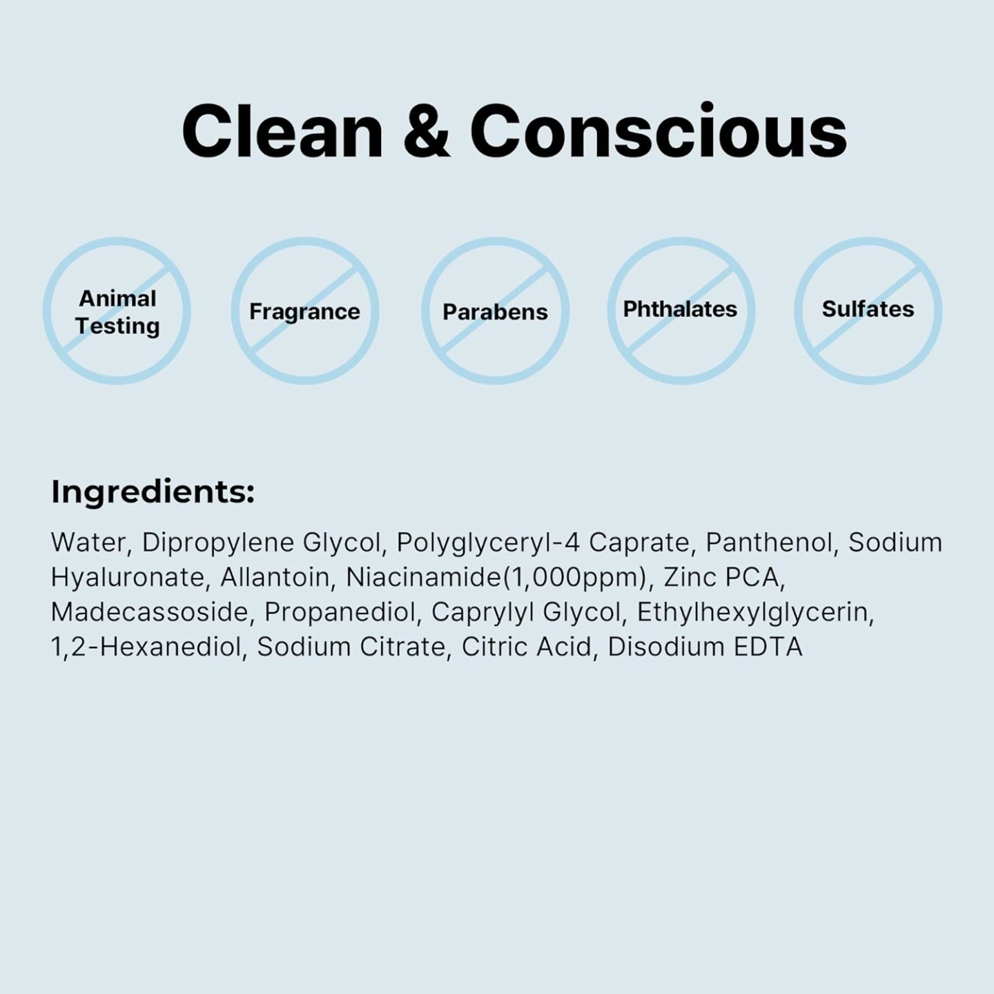 Water, Dipropylene Glycol, Polyglyceryl-4 Caprate, Panthenol, Sodium Hyaluronate, Allantoin, Niacinamide(1,000ppm), Zinc PCA, Madecassoside, Propanediol, Caprylyl Glycol, Ethylhexylglycerin, 1,2-Hexanediol, Sodium Citrate, Citric Acid, Disodium EDTA