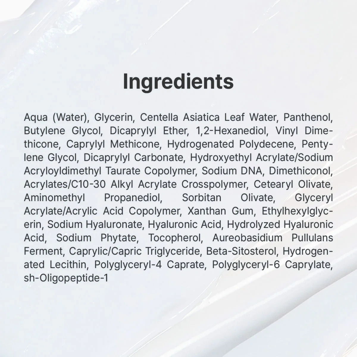 Water, Centella Asiatica Leaf Water, 1,2-Hexanediol, Panthenol, Glycerin, Glyceryl Acrylate/Acrylic Acid Copolymer, Sodium DNA, Butylene Glycol, Dicaprylyl Ether, Tocopherol, Vinyl Dimethicone, Dimethiconol, Hydrogenated Polydecene, Caprylyl Methicone, Dicaprylyl Carbonate, Pentylene Glycol, Hydroxyethyl Acrylate/Sodium Acryloyldimethyl Taurate Copolymer, Cetearyl Olivate, Sorbitan Olivate, Acrylates/C10-30 Alkyl Acrylate Crosspolymer, Aminomethyl Propanediol, Ethylhexylglycerin, Xanthan Gum, Hydrolyzed Hyaluronic Acid, Hyaluronic Acid, Sodium Phytate, Sodium Hyaluronate, sh-Oligopeptide-1, Caprylic/Capric Triglyceride, Beta-Sitosterol, Hydrogenated Lecithin, Polyglyceryl-4 Caprate, Polyglyceryl-6 Caprylate, Aureobasidium Pullulans Ferment